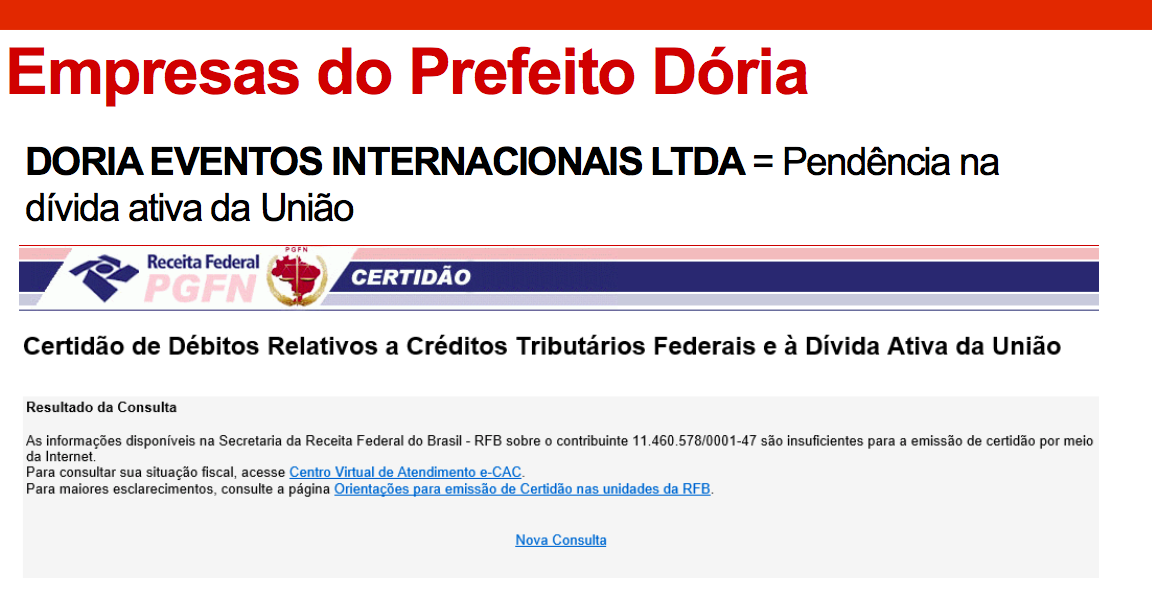 Diário do Centro do Mundo-O vereador Antônio Donato, do PT, denunciou, da tribuna da Câmara Municipal de São Paulo, novas dívidas de João Doria, desta feita de seus empreendimentos.Uma delas é a Doria Administração e Eventos, que atua, oficialmente, na área de propaganda. Foi fundada em 1996. O capital social, de acordo com o site EmpresasCNPJ, é de 40 milhões de reais.A outra é a Doria Eventos Internacionais — que, curiosamente, tem a mesma descrição oficial: “empresa privada que atua na área de propaganda”.